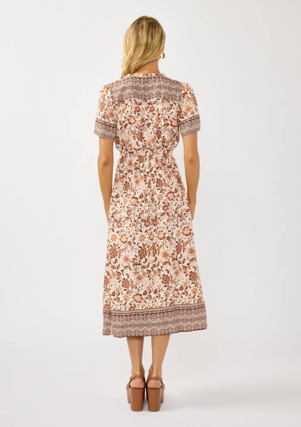 Perfect for fall, this border floral rayon challis midi dress features a ruffled neckline, flutter sleeves, and delicate shirring, with a smocked waist and flowing skirt finished by a clean hemline.