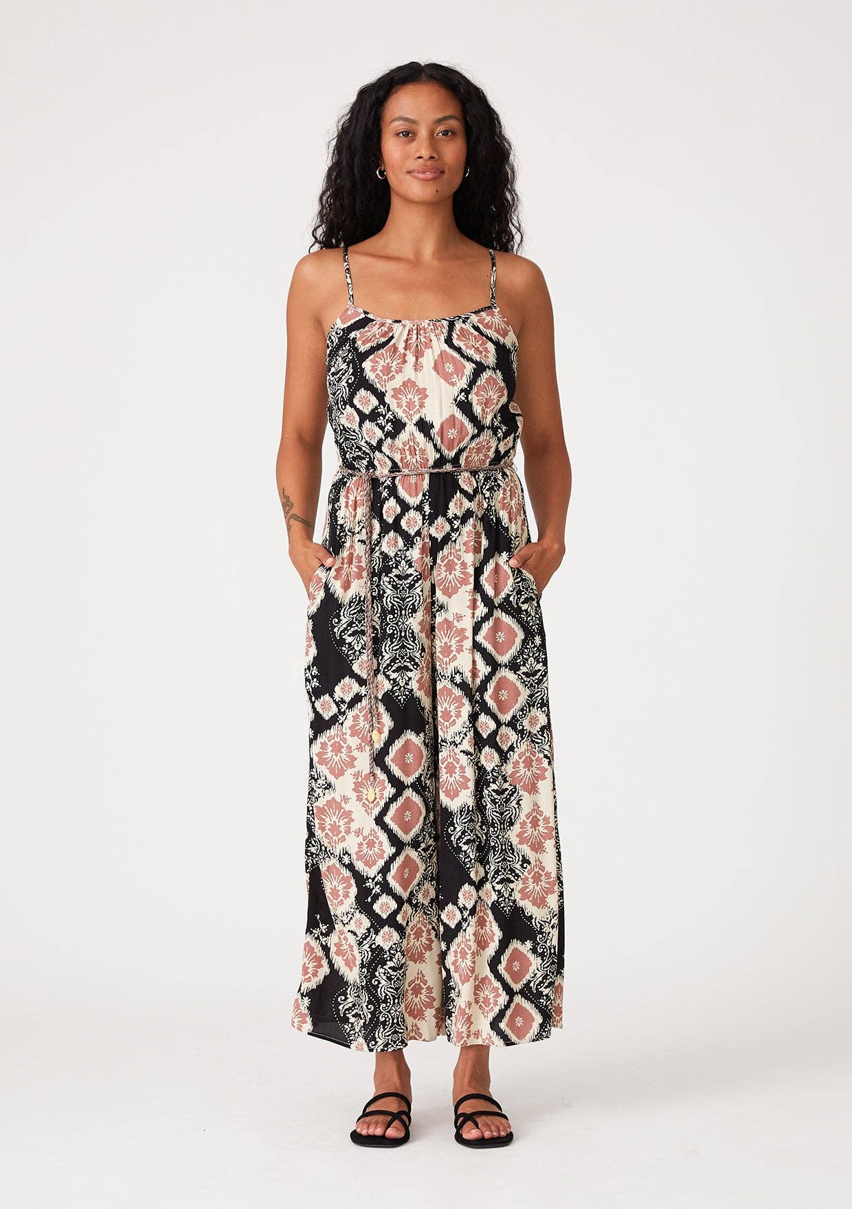 Bohemian printed jumpsuit with a scoop neckline and adjustable spaghetti straps. Features a smocked back, elastic waistline with rope tie, side pockets, and wide legs. The perfect Summer jumpsuit to take on vacation.