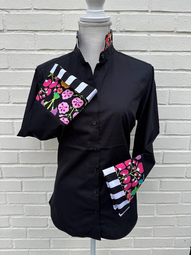 Beth Bell Sleeve 3/4 -Black w Floral and Black Stripe